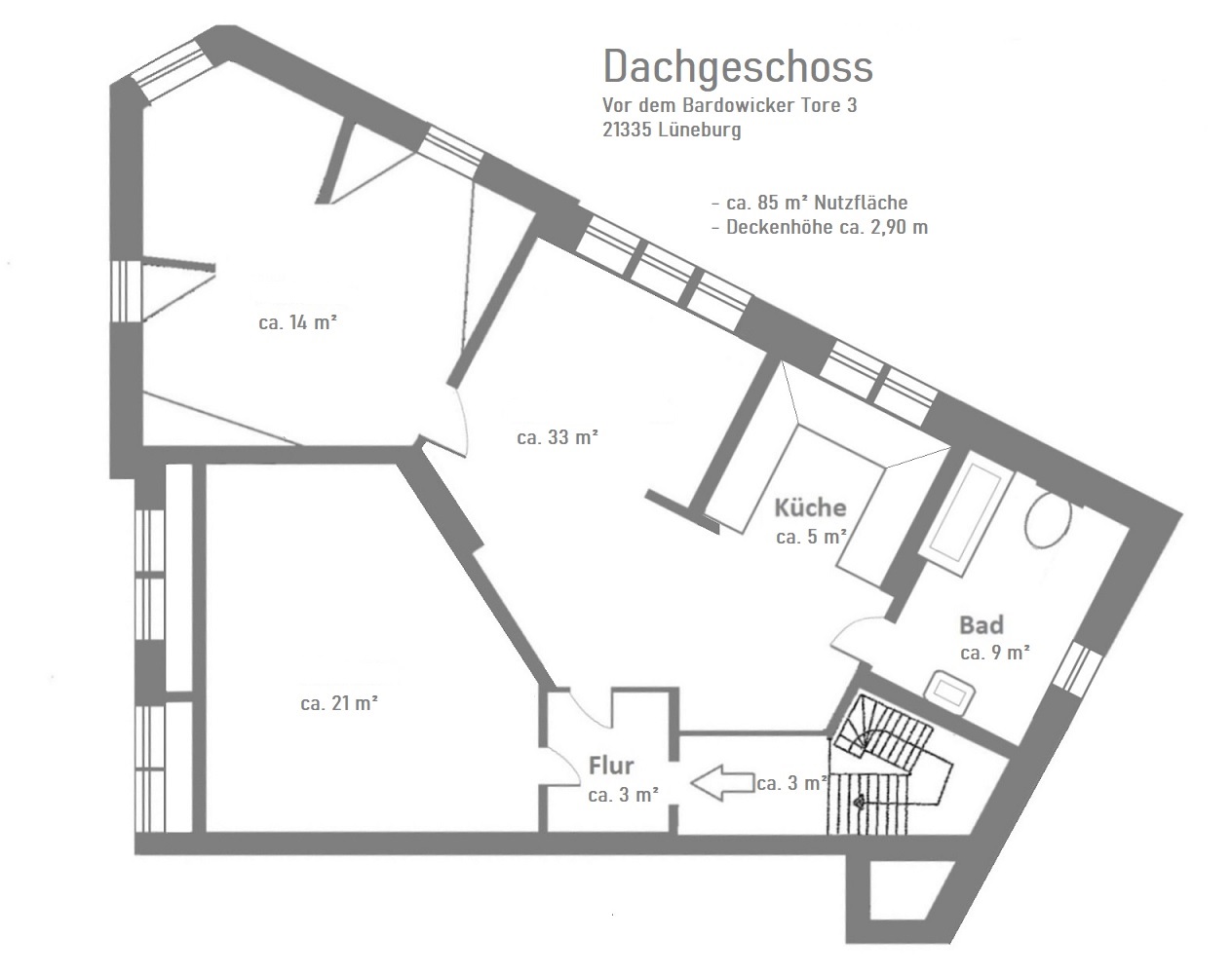 Die hier angebotenen Räumlichkeiten befinden sich im 3. Obergeschoss eines denkmalgeschützten Geschäftshauses. Es gibt 3 helle Räume, einen kleinen Flur, eine offene Küche (inkl. Geschirrspüler Kühlschrank mit Gefrierkombination, Backofen, Cerankochfeld, Wasserkocher, Kaffeemaschine, Geschirr, Gläser, Besteck, etc.), Bad/WC, einen Abstellraum und einen Kellerraum. Weitere Ausstattung: Sonnenschutzrollos an den Dachflächenfenstern (neu), mobile Klimaanlage, Gegensprechanlage, Gesamtfläche ca. 85 m².